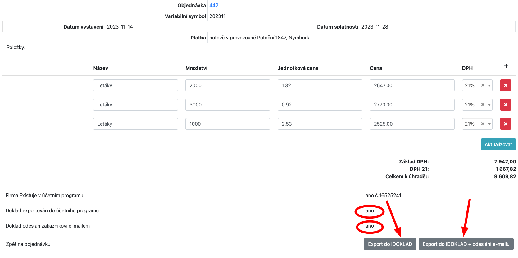V případě klienti na tlačítko "Export do iDokladu + odeslání e-mailu" se navíc z Dokladu odešle zákazníkovi faktura ne e-mail uvedený u kontaktu.