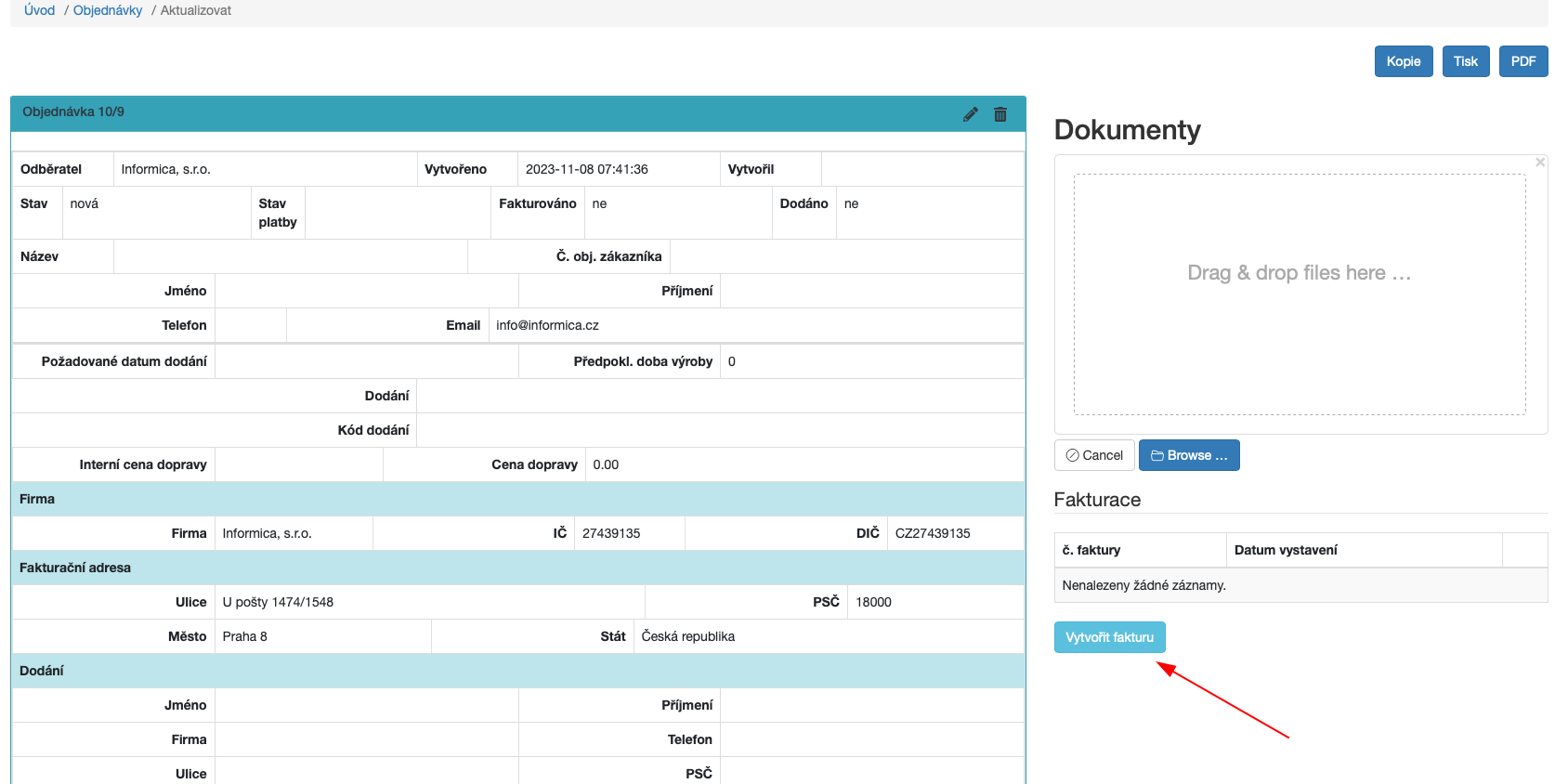 V sekci Objednávky / zakázky zvolte příslušnou objednávku a v detailu klikněte na tlačítko "Vytvořit fakturu". Systém vytvoří fakturu a přejde na zobrazení detailu faktury.